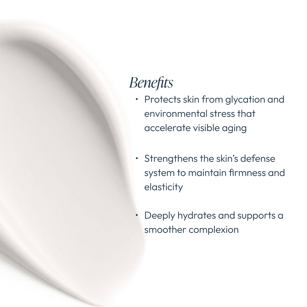 - Προστατεύει το δέρμα από τη γλυκοζυλίωση και τους στρεσογόνους παράγοντες που επιταχύνουν τη γήρανση
